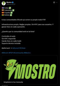 Cuatro comunidades hispanas ya tienen su propio exchange P2P de bitcoin. Fuente: @MostroP2P – X.