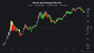 El siguiente gráfico sobre el tamaño promedio de órdenes al contado (spot average order size) en los exchanges refuerza esta lectura. Las grandes zonas verdes, que representan órdenes de ballenas, dominan claramente. Como indica la Criptopedia, sección educativa de CriptoNoticias, las ballenas son vigiladas meticulosamente por la comunidad bitcoiner y demás inversores, pues sus acciones pueden influir en la liquidez y los precios del mercado.