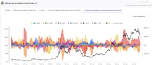 Esta conducta se refleja en el gráfico de acumulación/distribución a continuación, donde se evidencia que ambos segmentos han ejercido presión constante sobre el precio de bitcoin.