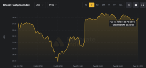 Aquel 7 de febrero, coincidiendo con el descenso de la dificultad de minado, el hashprice subió desde los 30 dólares hasta alcanzar, esa misma jornada, casi los 36 dólares por petahash al día (USD/PH/día), según datos de Hashrate Index confirmados por el pool Braiins.