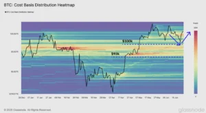 La siguiente gráfica, llamada Mapa de Calor de la Distribución de la Base de Costos, permite visualizar la distribución de los precios a los que los inversores adquirieron BTC y cómo estos se concentran en ciertos rangos de precios. En este caso, se destaca el rango de 93.000 y 100.000 dólares como un área clave de compra.