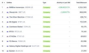 La magnitud de la reserva de BitMine es notable al compararla con sus competidores directos. Actualmente, la empresa supera con amplia ventaja a la segunda empresa con más ETH, SharpLink, que tiene 868.699 ETH, como se aprecia en la imagen.