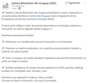 La Cámara Blockchain de Uruguay presentó sus propuestas para integrar en la propuesta de regulación del sector los activos digitales. Fuente: Linkedin/CBU.